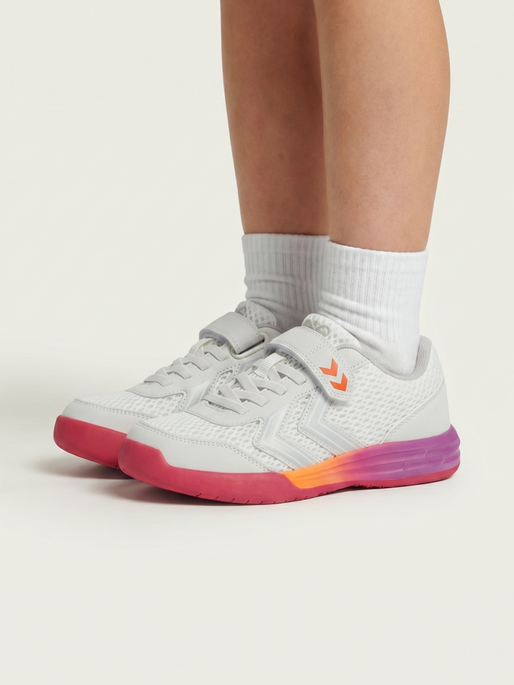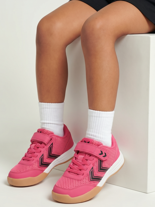 hmlSHIMMER T-SHIRT S/S er laget av glatt, mykt strikket interlock-materiale. Den har et dekorativt allover-trykk med glitrende effekt og korte ermer med klassiske hummel-chevrons på skuldrene.